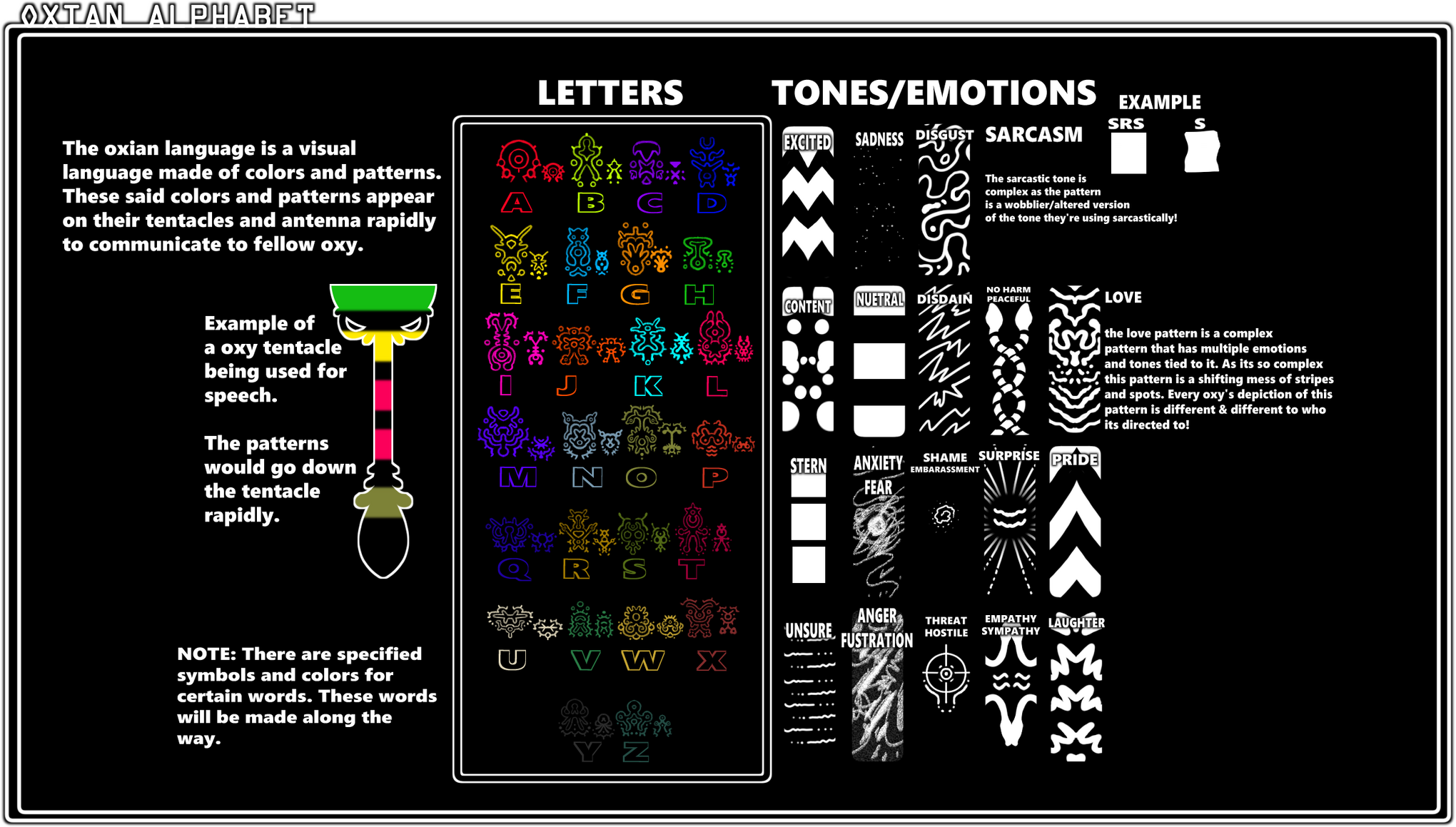 The main language for all oxian no matter the host is a series of colors and patterns done through their tentacles and antenna. Each variation of the language is dependent on the host but most have an internal alphabet instinctually put into them at birth.Depending on the host the language can become more complex or simple.Above we have the humanoid/sentient oxian alphabet.